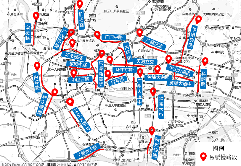假期期间,市内整体交通运行良好,路网运行主要处于“基本畅通”至“轻度拥堵”状态。市民出行以休闲娱乐、观光购物等为主,出行热点为正佳广场、北京路等核心商圈及广州塔、动物园、白云山、永庆坊、长隆旅游度假区、花都融创乐园等景点,出行高峰集中在10时—12时、14时—18时,其间商圈、景点周边道路或有局部车流缓慢。