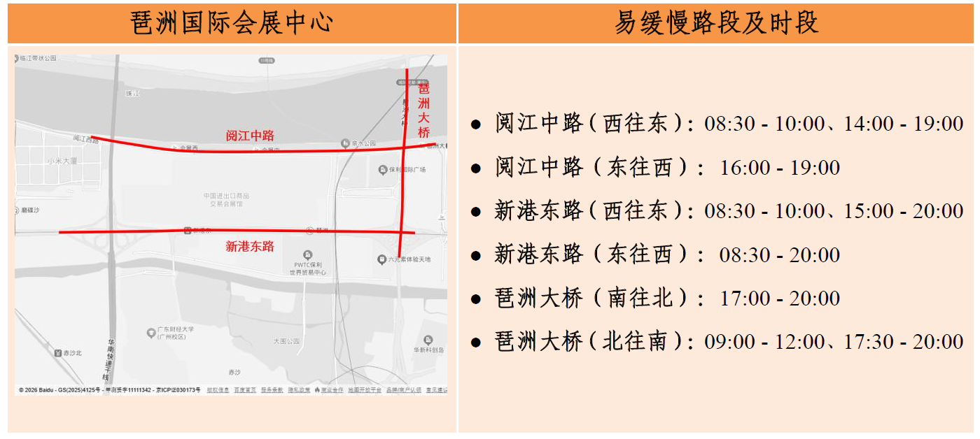 此外,假期适逢第139届广交会(第三期),展会客流、车流与假期出行客流相互交织,预计琶洲展馆周边的阅江中路、新港东路、琶洲大桥等车流量较大。