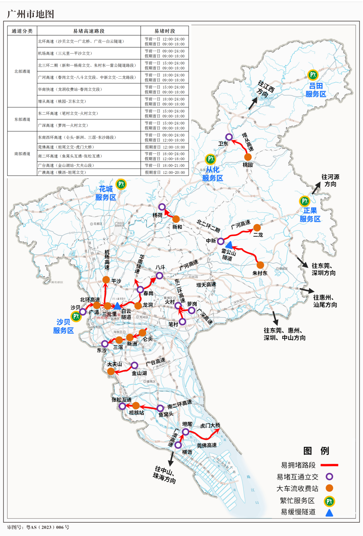 假期首日(5月1日)的9时—18时,还将有一波出行高峰,峰值点预计出现在12时。其间北环高速(沙贝立交—广清收费站、广清收费站—广北桥、广花—白云隧道)、机场高速(三元里—平沙立交)、北三环二期(新和—杨荷立交、朱村东—雷公山隧道路段)、广河高速(春岗立交—八斗立交、中新立交—二龙路段)、华南快速(龙洞收费站—春岗立交)、增从高速(桃园—卫东立交)、东二环高速(笔村立交—火村立交)、广深高速(萝岗—火村)、东南西环高速(仑头—新洲、三滘—东沙路段)、广台高速(金山湖站—大夫山)、南二环高速(鱼窝头互通—张松互通)、莞佛高速(坦尾立交—虎门大桥)、广澳高速(横沥桥—坦尾立交)等瓶颈路段易出现车多排队通行的情况。