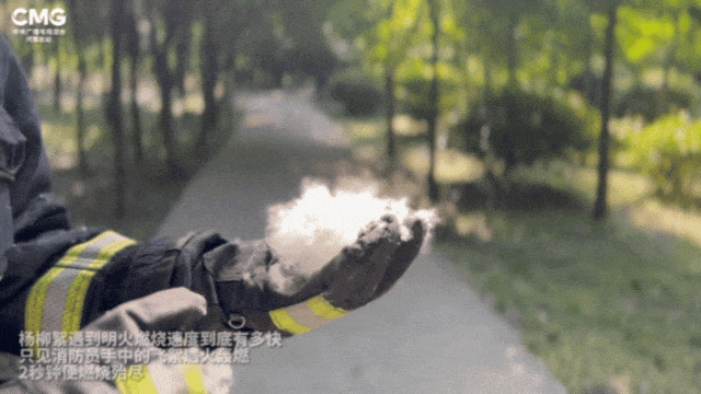实验一:消防员手中的飞絮遇火轰燃,2秒钟便燃烧殆尽 图源:新华社