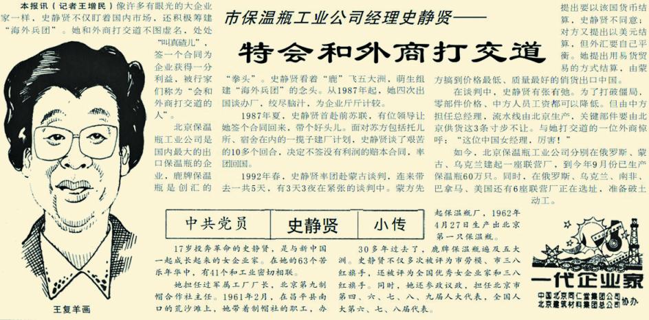 上世纪90年代,改革开放进入新阶段,中国企业与全球市场的联系日益紧密。全国三八红旗手、北京保温瓶工业公司总经理史静贤的视野也从国内延伸至全球。她不仅将“鹿牌”保温瓶打造成出口创汇的拳头产品,更萌生了组建“海外兵团”、直接在海外投资建厂的战略构想。自1987年起,她四次出国谈办厂,不但打破了僵局,还在洽谈中为企业争得了利益。与她打交道的一位外商惊呼:“这位中国女经理,厉害!”到1994年,北京保温瓶工业公司已在俄罗斯、蒙古国、乌克兰建成联营厂。(1994年11月1日《北京日报》1版,《市保温瓶工业公司经理史静贤——特会和外商打交道》)