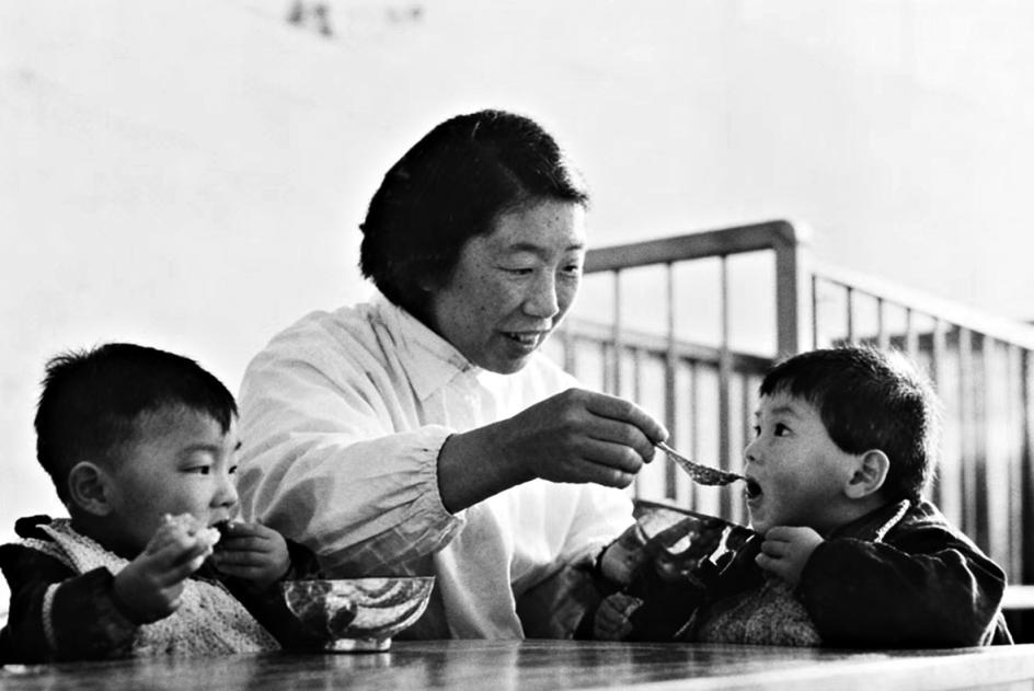 1965年,全国三八红旗手、保育员朱玉兰给孩子喂饭。 米永志摄
