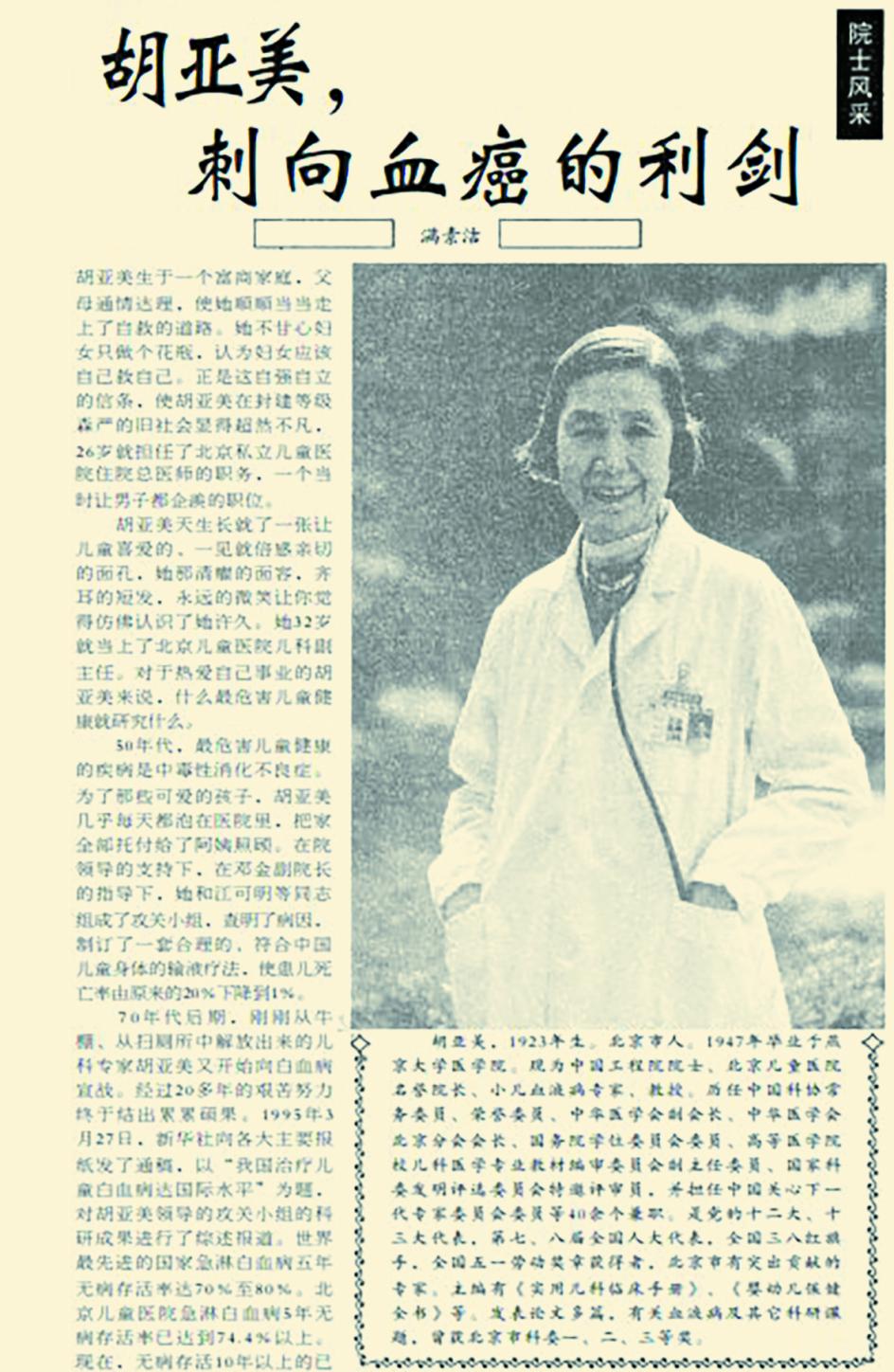 全国三八红旗手胡亚美院士的故事诠释了医学科技工作者“人民至上”的深沉情怀。作为北京儿童医院名誉院长,她的科研方向始终紧扣危害儿童健康的最迫切问题。上世纪50年代,她为攻克中毒性消化不良症,以院为家,最终将患儿死亡率从20%降至1%。上世纪70年代末,当白血病成为新的威胁时,她又毅然带领团队向这一“癌王”宣战。经过20余年不懈攻关,到1995年,其团队治疗儿童白血病的水平已达国际先进。(1997年5月23日《北京日报》7版,《胡亚美,刺向血癌的利剑》)