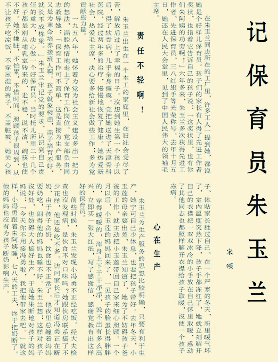 当时,很多单位为了让职工没有后顾之忧地安心工作,都开办了托儿所。小孩几个月大就可以放到托儿所,同时招收一些家庭妇女当保育员。全国三八红旗手朱玉兰就是其中之一。她非常珍惜这个工作机会,对孩子们特别关爱,不让他们吃凉饭、穿湿裤。一个冬天,托儿所暖气坏了,她立即解开衣襟,把孩子们冻红的小手放进自己怀里取暖。有个孩子的妈妈出差,她主动将孩子接回家,照料了长达1个月。不仅如此,她还用奖金购买工具为孩子们理发,主动帮请假同事值班……(1965年6月2日《北京日报》2版,《记保育员朱玉兰》)