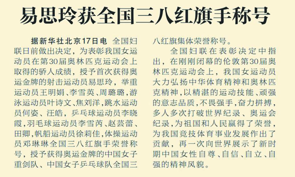 2012年7月28日,中国射击选手易思玲在伦敦奥运会上为中国夺得该届奥运会首金,并在当年荣获全国三八红旗手称号。