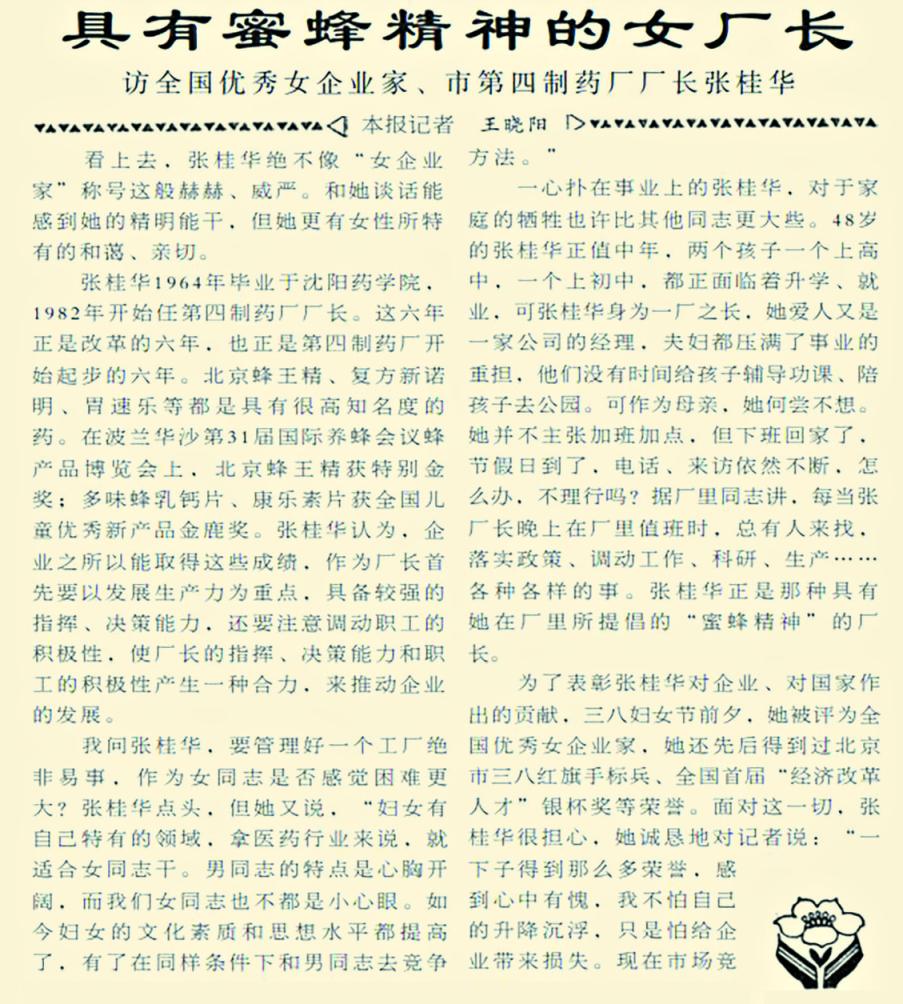 北京第四制药厂厂长张桂华上任后,带领全厂以发展生产力为核心,巧妙地将厂长的决策力与职工的积极性凝聚成强大合力,国产精品成人久久久久久久不仅显著提高了职工收入,更推动研发了“北京蜂王精”等荣获国际金奖的知名产品。张桂华因此荣获北京市三八红旗手标兵等荣誉,其管理实践体现了改革初期调动“人”的积极性以释放企业活力的鲜明时代特征。(1988年3月8日《北京晚报》1版,《具有蜜蜂精神的女厂长》)