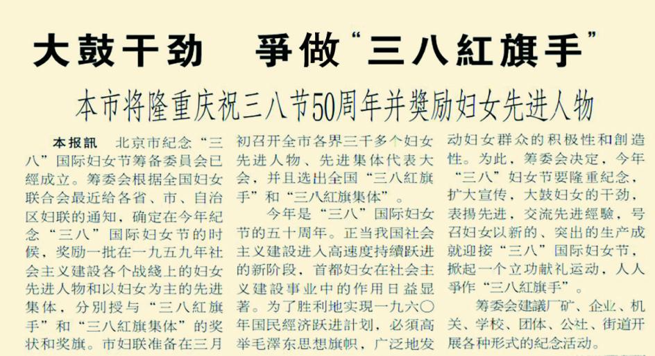 当年,1万名先进妇女和先进集体,光荣地获得了三八红旗手和三八红旗集体荣誉称号,成为激励一个时代的榜样。(1960年3月6日《北京日报》1版,《一万先进妇女和集体受到奖励》)