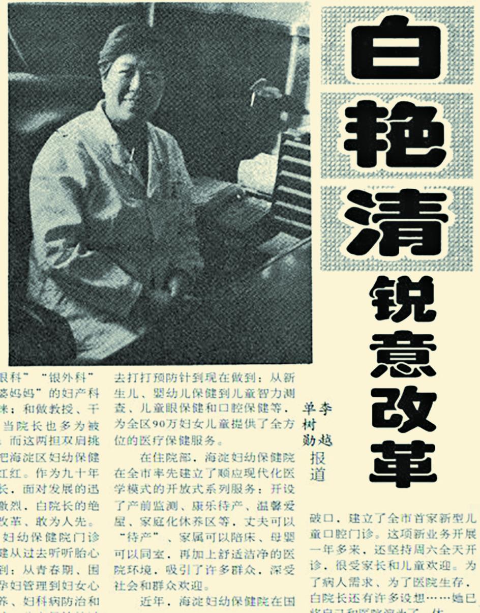 北京市三八红旗手、海淀区妇幼保健院院长白艳清也是一位锐意改革者。上世纪90年代末,她率先在全市推行顺应现代医学模式的“人文产科”服务,开设康乐待产、温馨爱屋、家庭化休养区,允许丈夫陪产、家属陪护、母婴同室,彻底改变了传统产科的冰冷印象。此外,她还建立了全市首家新型儿童口腔门诊,并坚持周末开诊,以细致的服务关怀赢得了社会广泛赞誉。(1998年6月10日《北京日报》7版,《白艳清锐意改革》)
