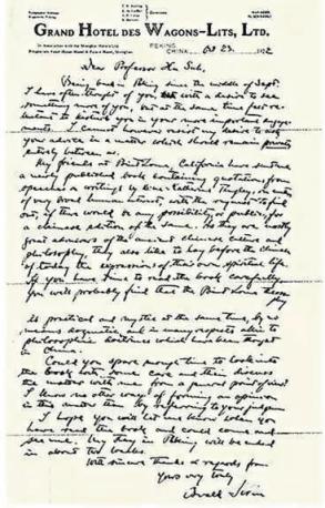 在给朋友的信中,他写道:“我相信我的任务将会越来越专注于中国艺术,我必须完成我的那些历史书。我唯一的希望是在世界的这一头也能够找到一些讨论和学习的机会……但是我为什么要抱怨呢?从我过去的旅程中,我收获了那么多绚丽的回忆和有趣的材料。”